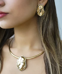 Doğanın akışından ilham alan bu organik formlu altın kaplama kolye, modern sanat dokusunu zarafetle birleştiriyor. Asimetrik yüzeyiyle sıradanlıktan uzak, göz alıcı bir duruş sunar. Parlak altın tonu ve heykelsi formu sayesinde hem sade hem de iddialı stillerin tamamlayıcısıdır.